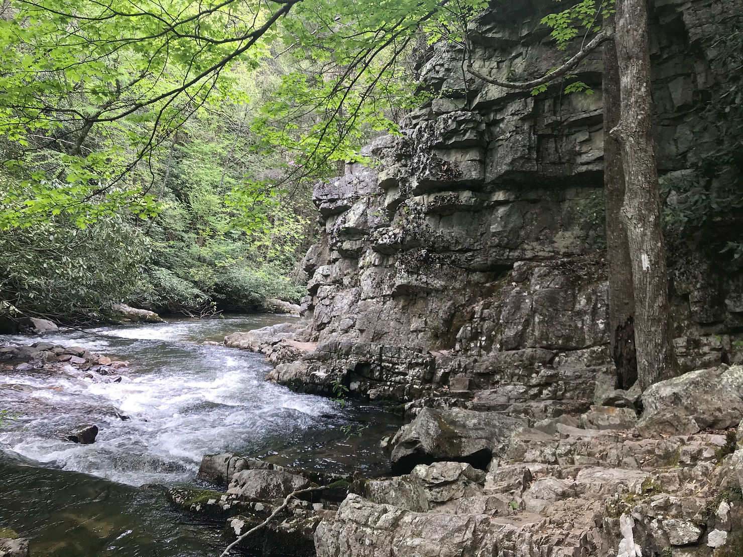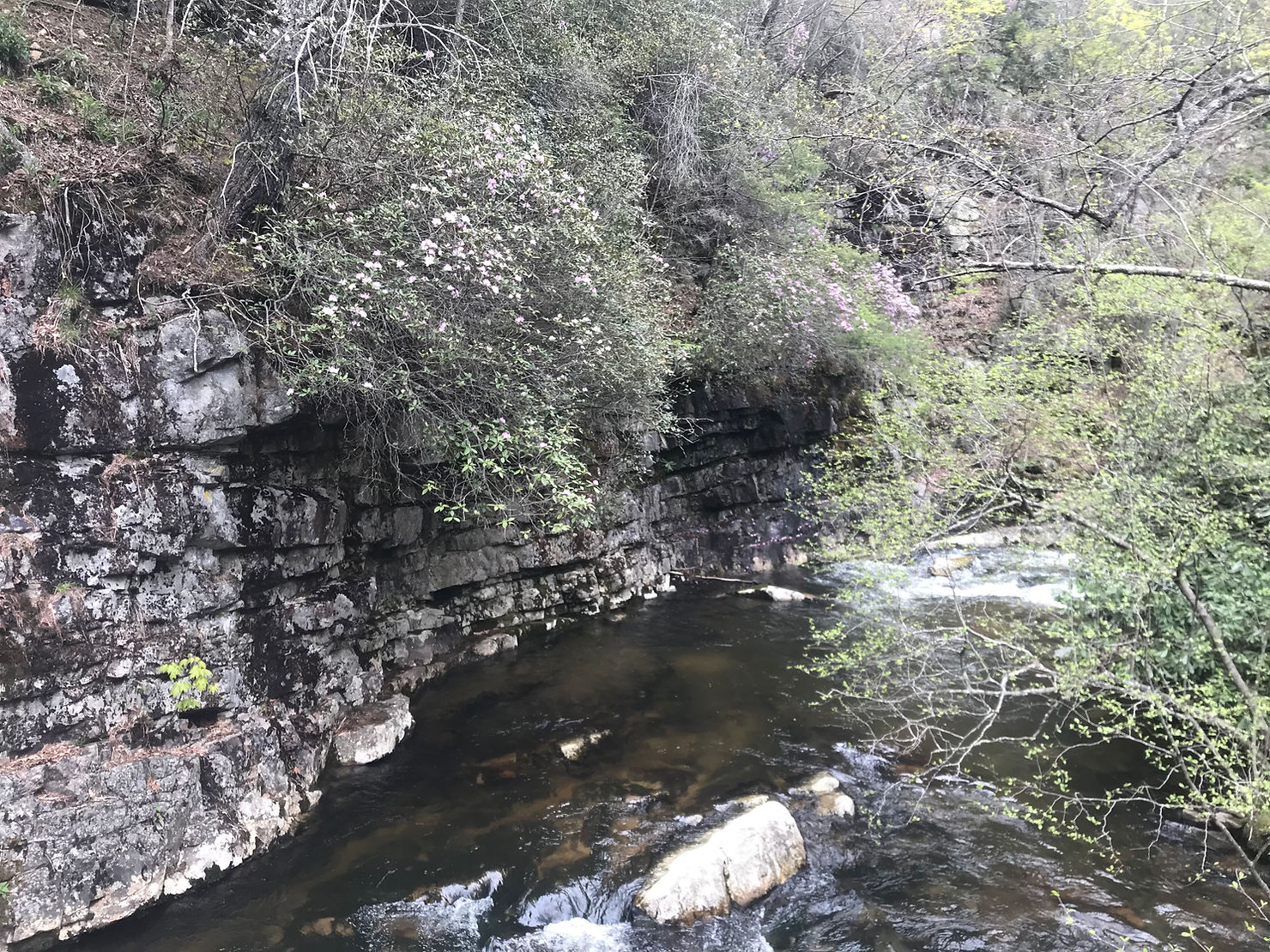 A couple of people stopped to ask what I was doing, and to think they were hiking on the AT and didn’t know it! The hike down to the falls was rocky and the falls were nice, but the trail along the river was my favorite! It was cut out of rock along the river and was beautiful, I even saw my first rhododendron blooms of the year!