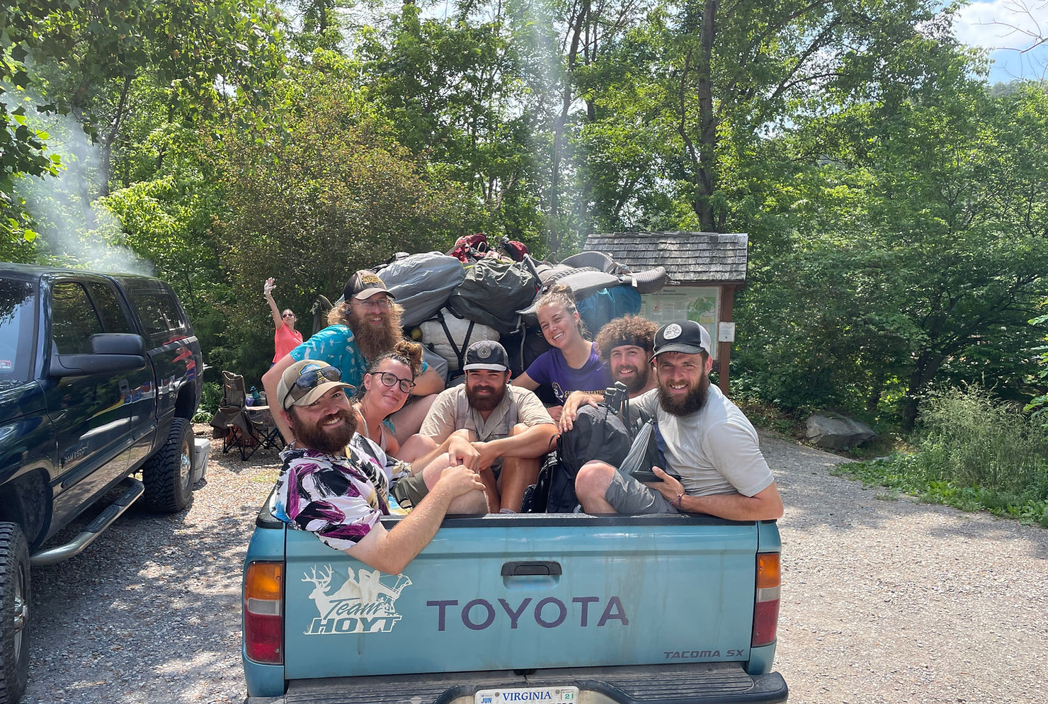 While we were waiting, the whole crew caught up and I convinced a random local to give 8 of us a ride in his pickup truck. He even ratchet strapped our packs to his toolbox in the truck bed.