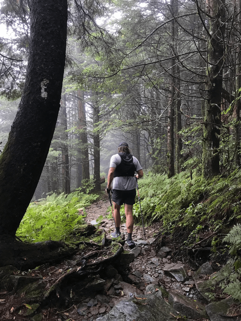 The miles between Clingman’s Dome and Newfound Gap were beautiful! We had perfect hiking weather: overcast and cool with patches of sunlight and brief glimpses of distant views. Cade recently invested in running vests for us, and we were able to carry our water, snacks, and water filter in our vests rather than having to lug around a pack. It’s incredible how much faster and stronger I feel without carrying 30+ pounds on my back. I felt like I was flying over the rocks and roots, and my trekking poles helped me to be more agile in navigating the uneven terrain.