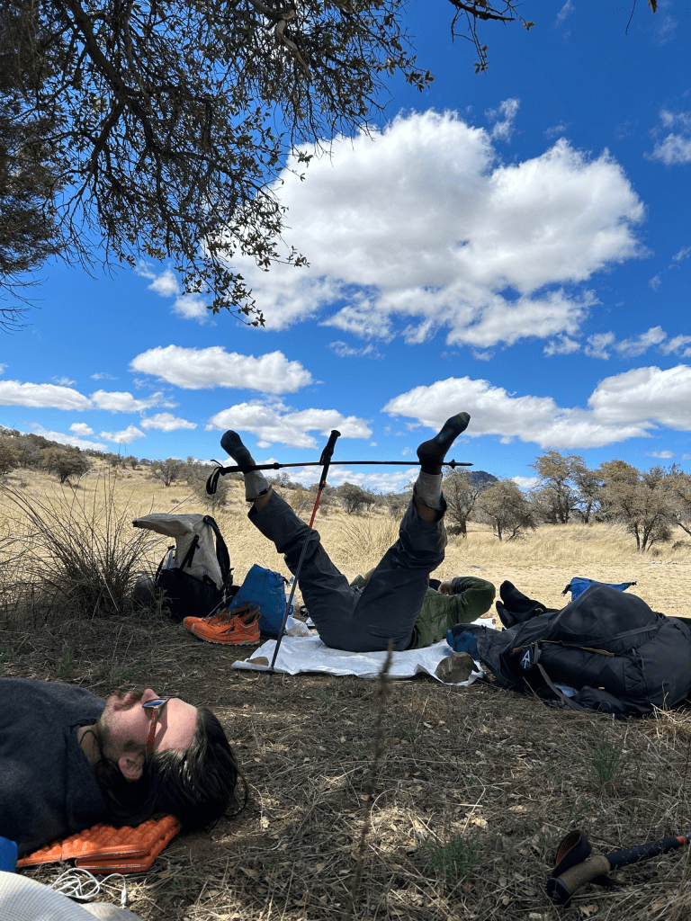 We hiked for several miles before stopping for a break at a water source. I took my shoes off and discovered I had new blisters forming. I didn’t have a signal blister the entire AT and have helped plenty of clients combat blisters while guiding backpacking trips, so I’m extra frustrated that I am having such a issue with my feet out there. I put more Leukotape on and we kept going for several more miles until we stopped for lunch.