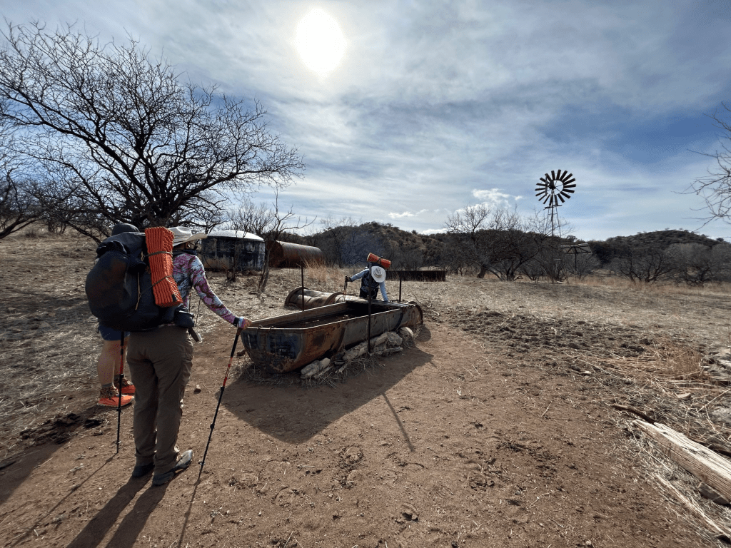 Once we got moving we only had a few cruisey miles until the next water source, our first cattle trough. The water itself was murky and filled with algae, but thankfully there was a pump that funneled up cleaner water. It still wasn’t crystal clear, but once we ran it through our filters it tasted fine. After filling up our water we enjoyed a nice break in the shade of a small windmill.