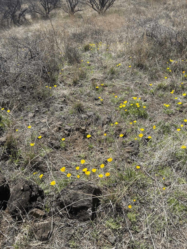 Back on the trail we followed an old stream bed through what looked like forgotten desert land. We saw more cow skeletons and treaded over sand and rocks. Eventually we reached a trail junction where the new AZT split from the old AZT. The trail sign was surrounded by California Poppies, our first time seeing them!