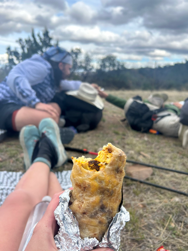 Once I started feeling better (and the pain meds kicked in) I knew I could hike on. Thankfully the next section of trail was mostly uphill, so that meant my knees wouldn’t give me any issues. I listened to the podcast “Dolly Parton’s America” and it helped me power up the hill until we eventually found Pimento and Hangman waiting for us at the top. We sat and ate the burritos we had packed out from town before tackling the second part of the day.