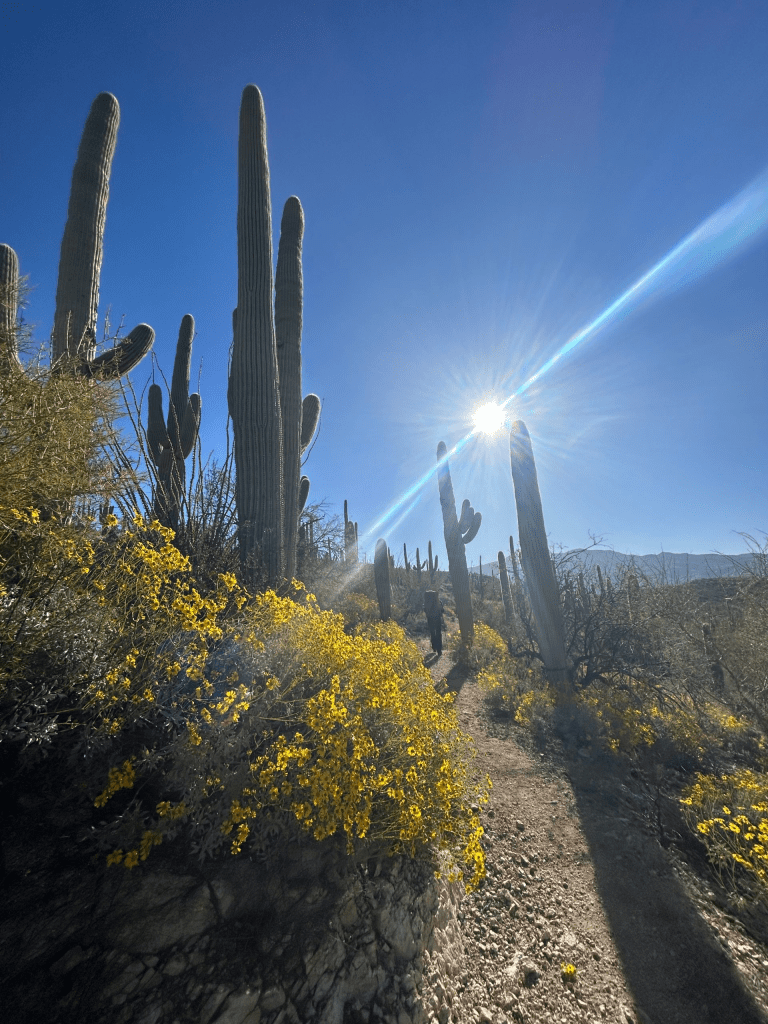 The first three miles of the day were beautiful! The trail was mostly flat and treaded over dirt and gravel. The mighty saguaro cactus towered all around us casting outlandish shadows along the trail. I couldn’t believe how many wildflowers were blooming. Pinks, yellow, oranges, and purples sprung up from the seemingly barren mountainside. Truffles and Bryce too their time capturing photos for their Seek app while Pimento and I trudged on.