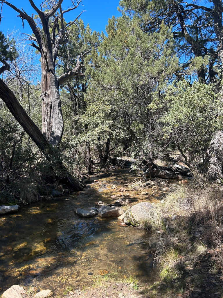 As we ventured higher in elevation, the landscape began to change. The cactus fell away and were replayed by elegant pine trees. We neared Grass Shack campground, one of two campgrounds AZT hikers can stay at in Saguaro National Park. A stream flowed through the middle of camp and there were plenty of shaded spots to rest. We relaxed and ate lunch as we tried to prepare ourselves for the massive climb ahead.