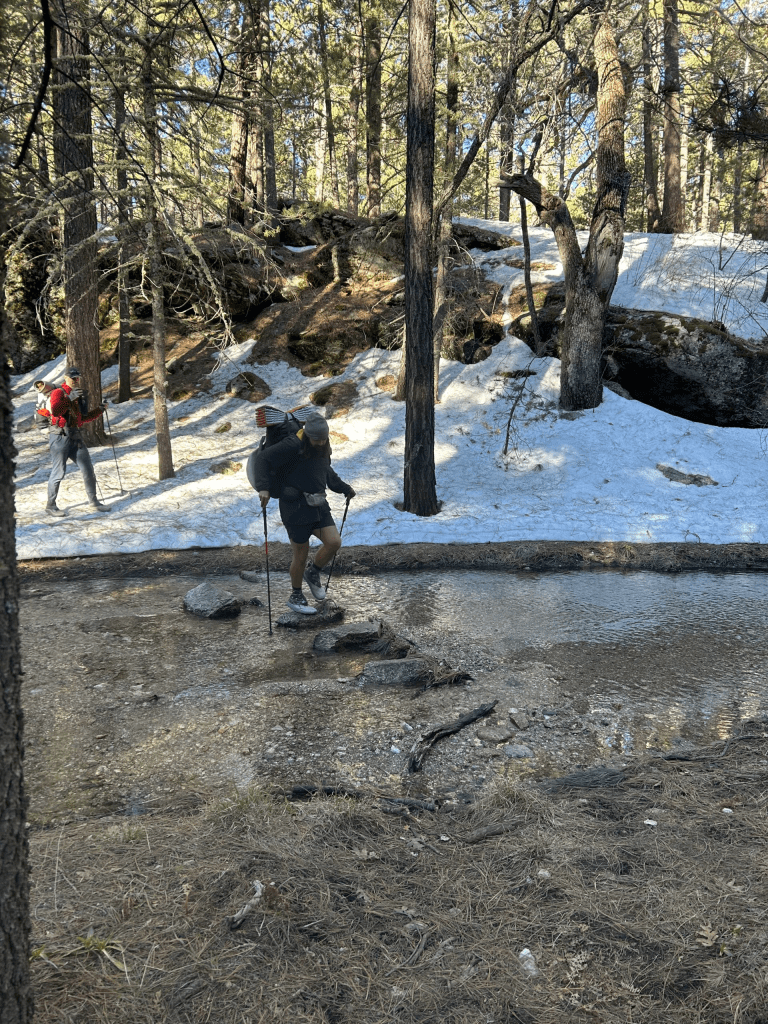 We had about 500’ to climb before beginning the big descent. The top of the maintain looked like a fairy wonderland with snow covering the ground and a crystal clear stream dancing between the trees. We made quick work of the climb before Pimento and Bryce put on their micospikes and we began moving down the mountain.