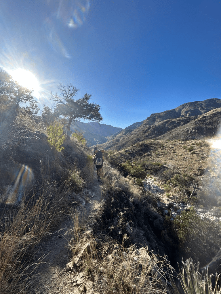 The sun was up in full force by the time we finally hit the trail. We had arranged to meet Tina, our Uber driver to Montezuma Pass on day one, at the Molino Basin trailhead at 9am, so we had about 4.5 miles to cover in 2 hours. The first mile was easy hiking through cattle country. Every morning our tramily sings “It’s a Great Day to Be Alive” by Travis Tritt, and this morning we got to serenade cows.
