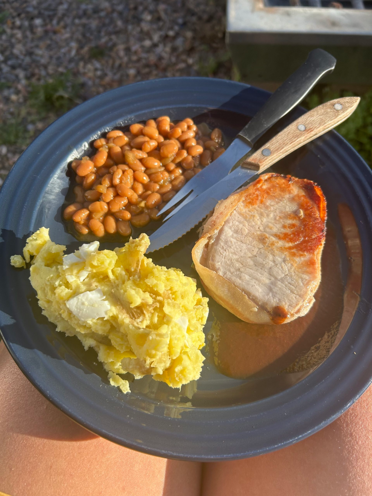 With bellies full we started our walk back to Al’s. When we arrived Al selflessly started cooking dinner for us. He told us that he loves to cook and sharing a meal with the hikers he hosts brings him so much joy. Al is a wonderful cook and even better company. The four of us sat outside on Al’s patio and ate pork chops, baked beans, and potato salad.