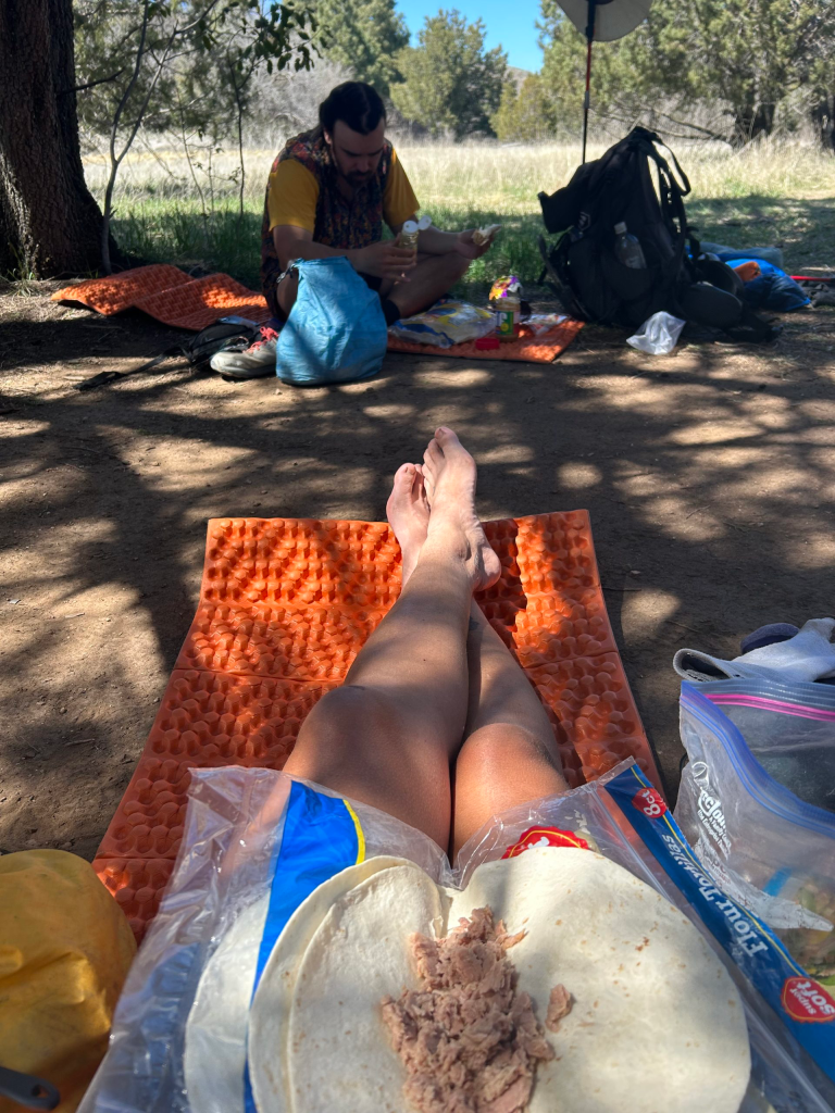 The trail once again became an ATV road. We had great long range views as we walked. The road walking quickly got boring and we all out headphones in and tried to power through the last miles of the day. We arrived at camp around 1pm and it was lovely! Normally this would have just been a lunch break, but because of our change of itinerary we only had to do 12 total miles today. It was so nice to do absolutely nothing the rest of the evening! Everyone took naps and just lounged around our campsite. As we were eating dinner more and more people started appearing at the campsite. Thankfully it’s super spacious and we all gathered around to talk about our hike so far. There were probably 10 people here, which is a rarity! We’ve gotten used to camping just the three or four of us. Another short day tomorrow and town after that!