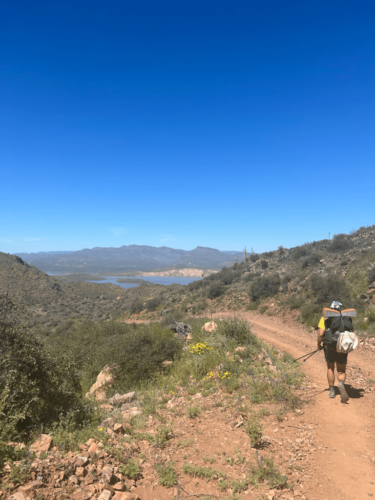 Looking at the elevation profile on FarOut we knew we were in for a big descent and ascent, the elevation profile literally looked like a letter V. We went straight down and straight back up. The downhill took it out of our knees, and the uphill made our muscles burn. They were both fairly short, thankfully, and we made good time and didn’t let that dampen our day. We hiked along a ridge for a couple miles and got our first views of Roosevelt Lake. It was super windy and we could see for miles, it made for good hiking weather.