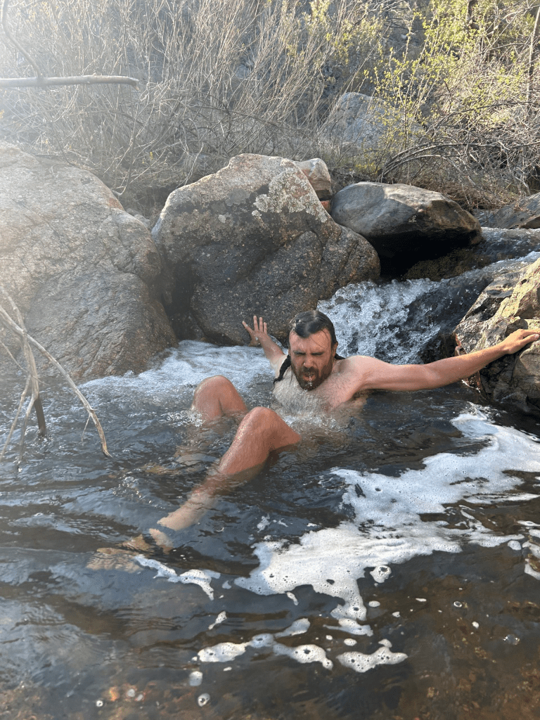 We made quick work of the trail between our campsite the night before and the original site we had planned to stay. We got water from Shake Spring and Truffles even took a plunge in one of the pools! We hung out for a bit so he could dry off before heading down the trail.