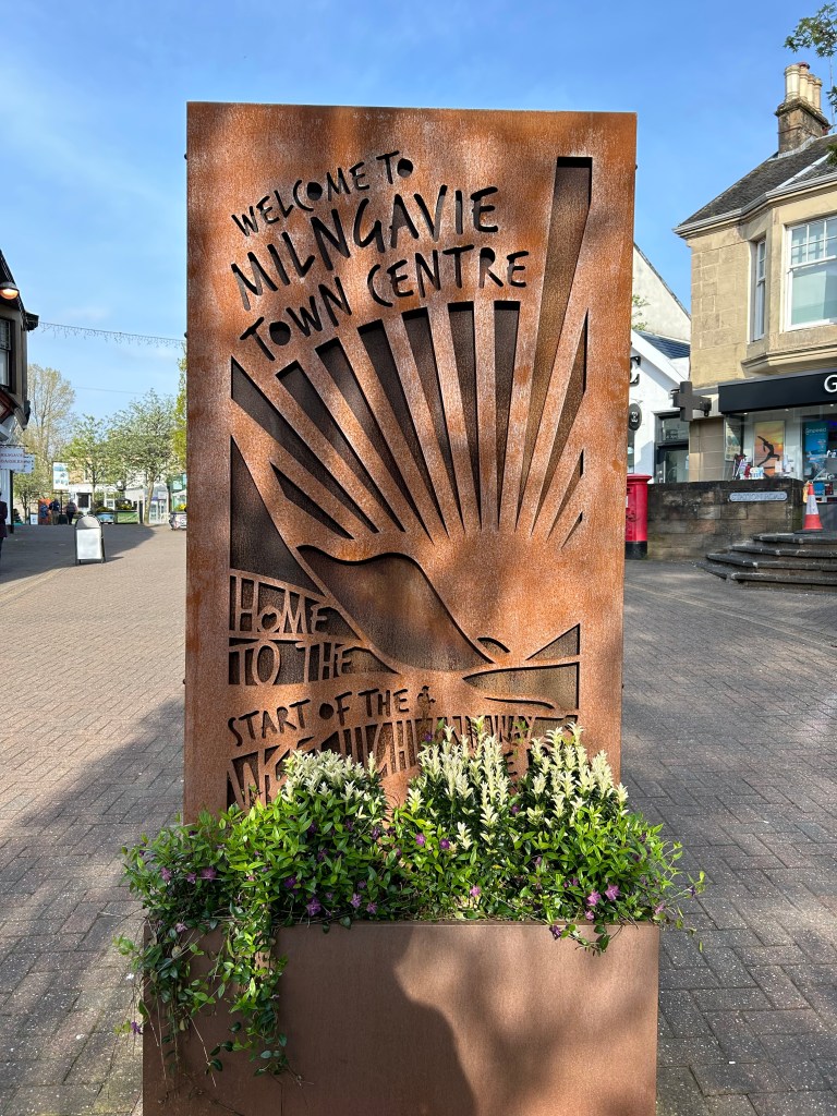 We passed back by the train station and walked through the enter of Milngaive to the obelisk that marks the start of the trail. It’s right smack dab in the middle of town! After a couple of quick pictures we were on our way. The trail was basically a greenway for the first few miles before it turned into smooth gravel/dirt trail following the river. We went up and over a couple of hills where we discovered the “scholar rocks” along a small stretch of trail. They were decorative and pretty and I was extra thankful for the sign explaining what they were: “Located across rural sites, the highly glazed, hand built ceramic rocks’ make connections to East Dunbartonshire geology and industries that once utilized resources provided by the landscape.”