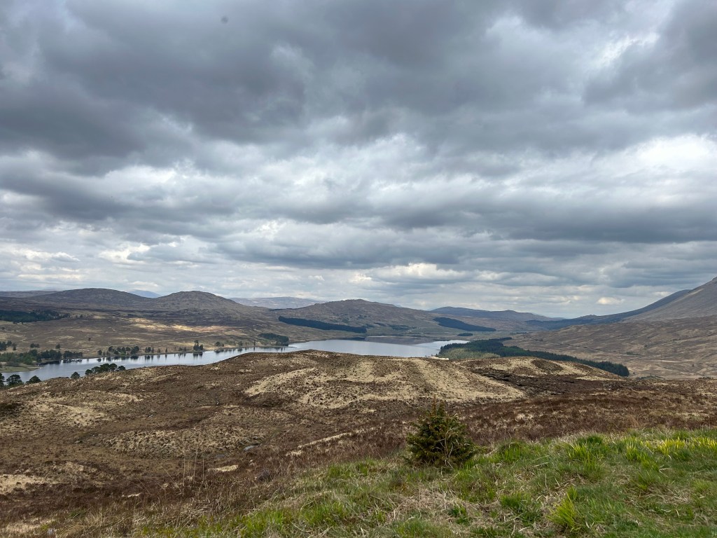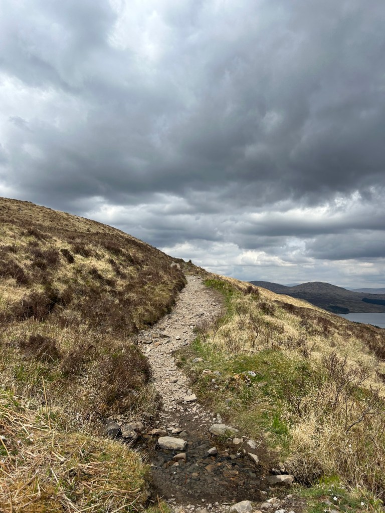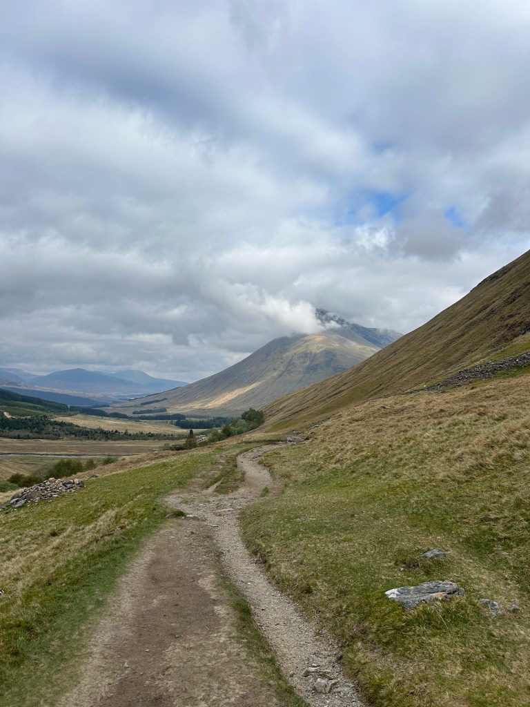 Once we had our fill we set off again. We got to cross what I assume was the bridge of Orchy over a river before we started going uphill. This was easily the hardest uphill stretch we’ve had yet! I hadn’t looked at the elevation profit so I had no idea what was coming. It was steep and felt super long but in reality it was over in less than fifteen minutes. Because of all the logging there were no trees so the views were panoramic once we got to the top. We could see lochs and even joked that a pointy mountain was the Matterhorn. We took in the view from the top for a bit before descending into Inveroran.