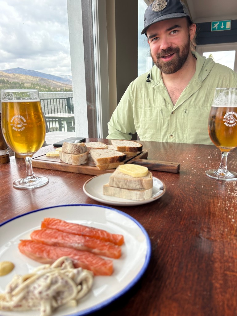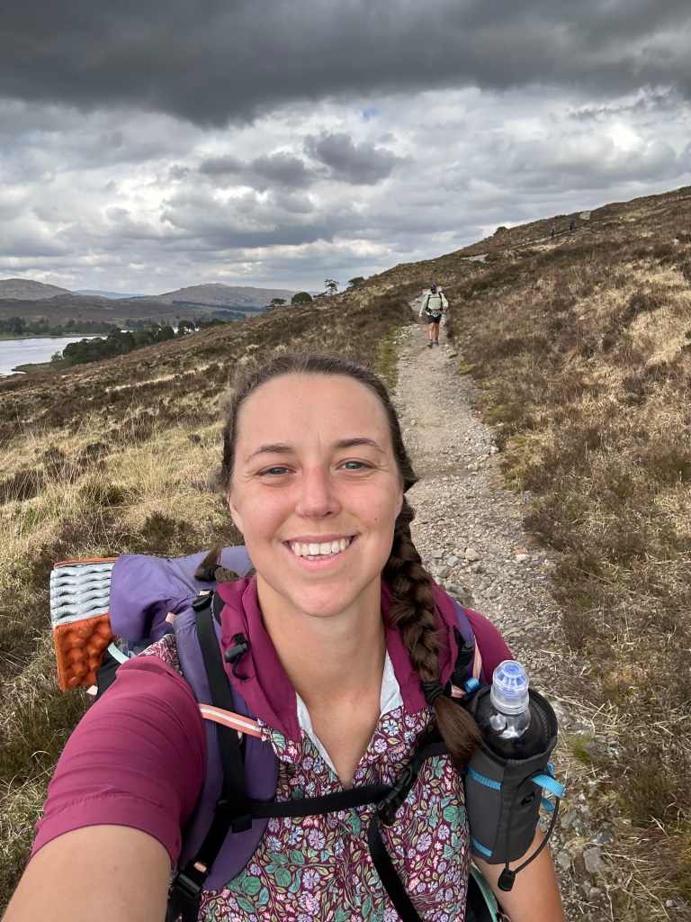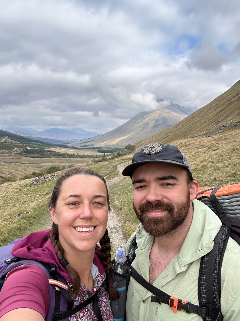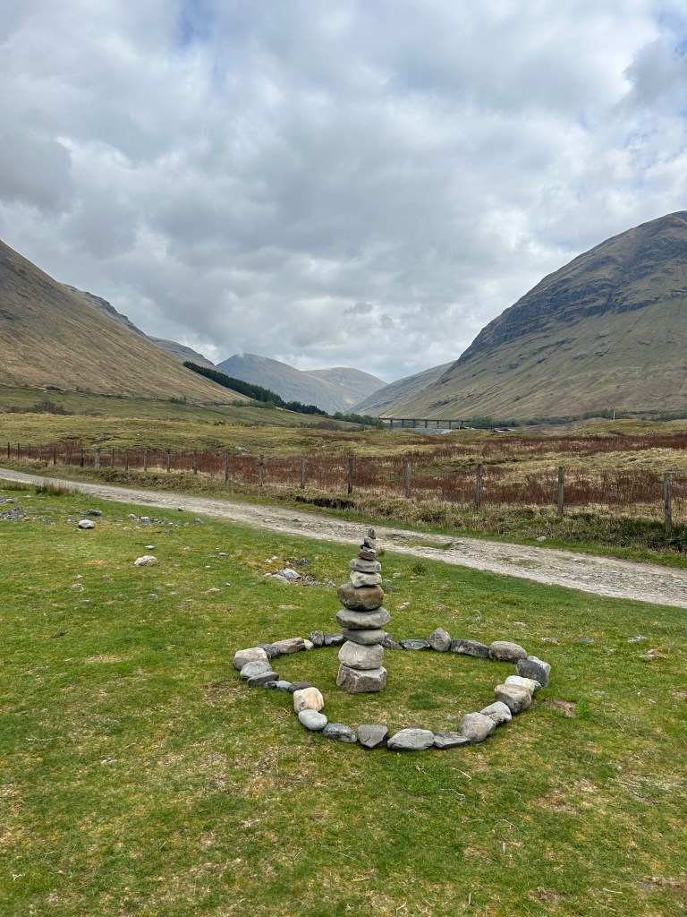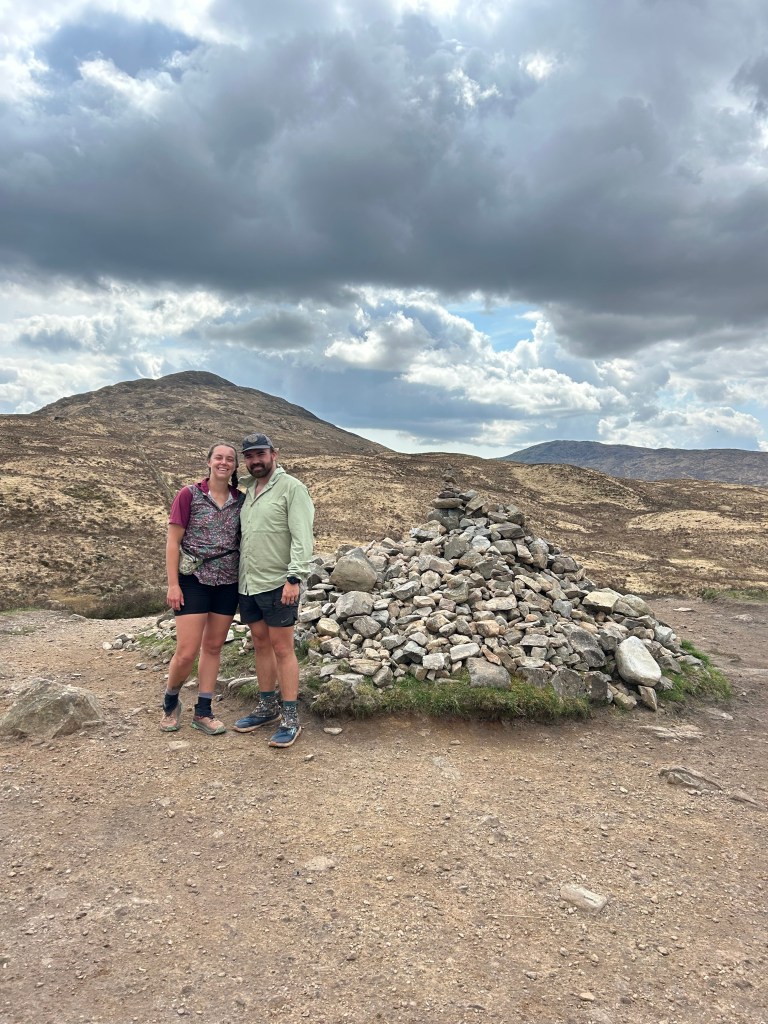 Hard to believe this journey is halfway over! Today was probably the most scenic in terms of sprawling mountain views. Neither Cade or I slept very good in our camping pod so we were eager to get up and get moving today. We took showers (with shampoo!) and I did yoga before we packed up and headed for town. We went back to The Real Food Cafe for breakfast. Cade got the Scottish breakfast and I had eggs with venison sausage and a black pudding roll. We ate our fill and walked over to The Green Welly which was like a giant gift shop, outfitter, and gas station all rolled into one. I got cold medicine (I have been very congested/snotty and think I have a cold) and we got coffees and were on our way.