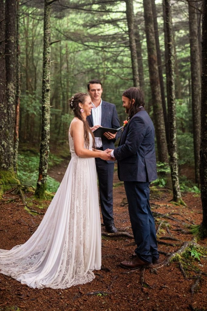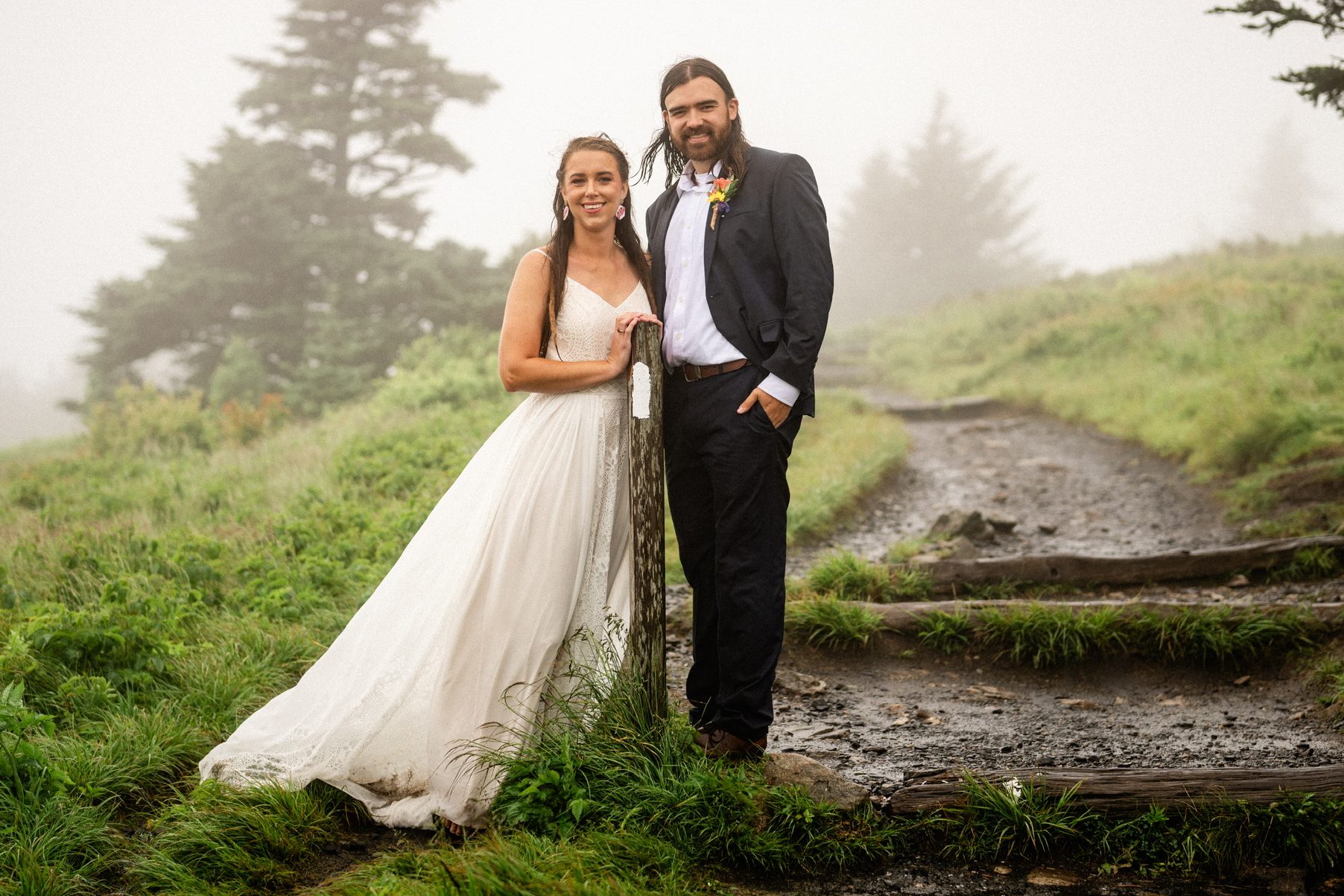 Our original plan had been to hold the ceremony on Round Bald, a grassy ridge with panoramic views in the Roan Highlands. Because of the inclement weather, Jared suggested we instead have the ceremony in a grove of conifer trees just behind the parking lot. That also meant we would be holding our wedding ceremony just behind the pit toilets. Given that we were hiker trash, the weather and the location suited us just fine.